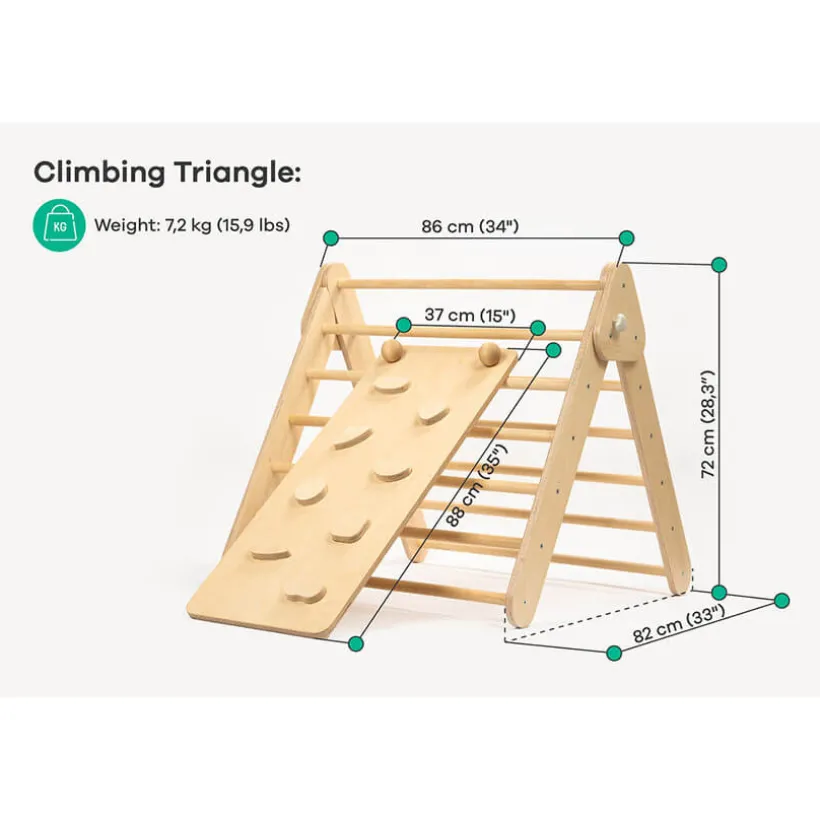 Onze Pikler driehoek is een veelzijdige functionele klimdriehoek die eindeloze leer- en pleziermogelijkheden biedt. De driehoek kan in veel verschillende vormen worden getransformeerd.
