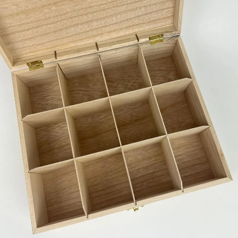 Houten kist met 12 vakken, om stekers voor je jaarring of stekerhouder in te bewaren. De afmetingen van deze bewaarkist zijn 29 x 25 x 8 cm (lxbxh).