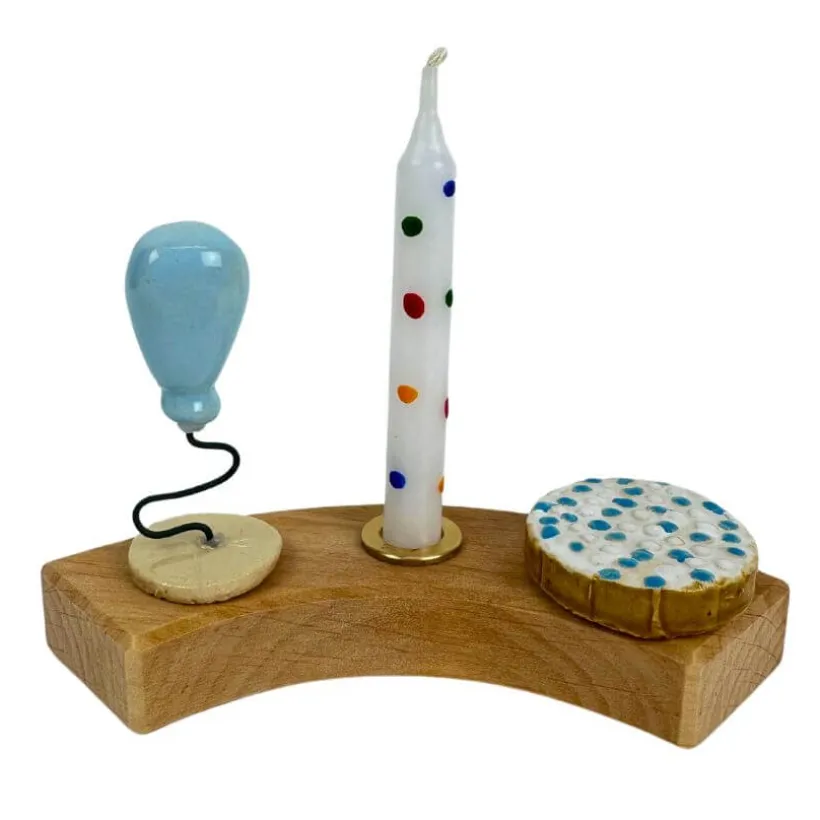 - Bevat: 2 keramieken stekers (blauwe ballon, beschuit met blauwe muisjes), 1 kaarsje, 1 messing kaarshouder