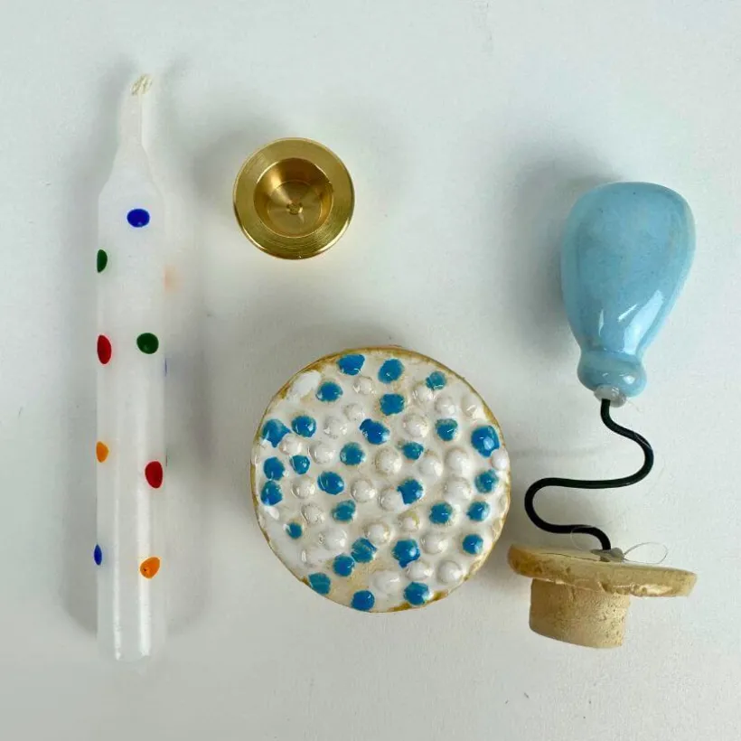 De 4-delige set bestaat uit 2 handgemaakte stekers van keramiek (ballon blauw en beschuit met blauwe muisjes), een confetti kaarsje en een messing kaarshouder.