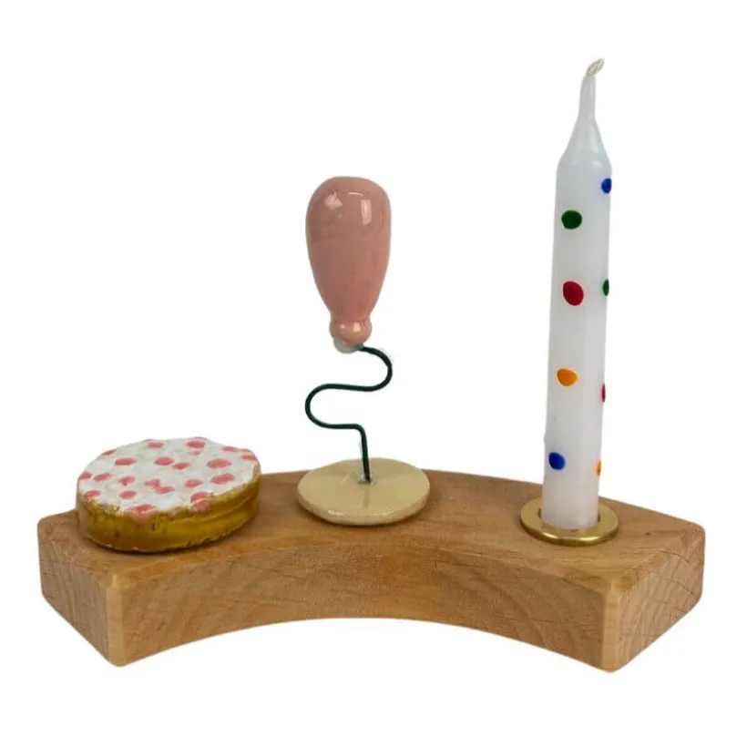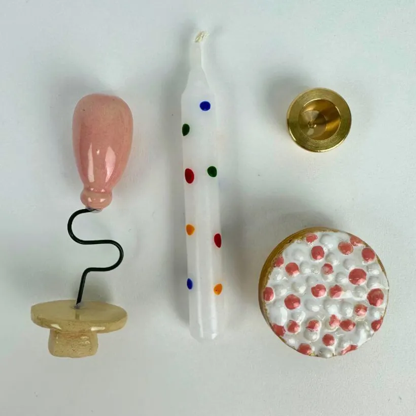 De 4-delige set bestaat uit 2 handgemaakte stekers van keramiek (ballon roze en beschuit met roze muisjes), een confetti kaarsje en een messing kaarshouder.