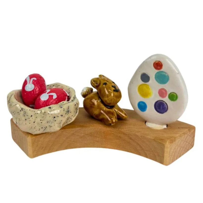 - Bevat: 3 keramieken stekers (konijntje, paasei gestippeld, organisch schaaltje)