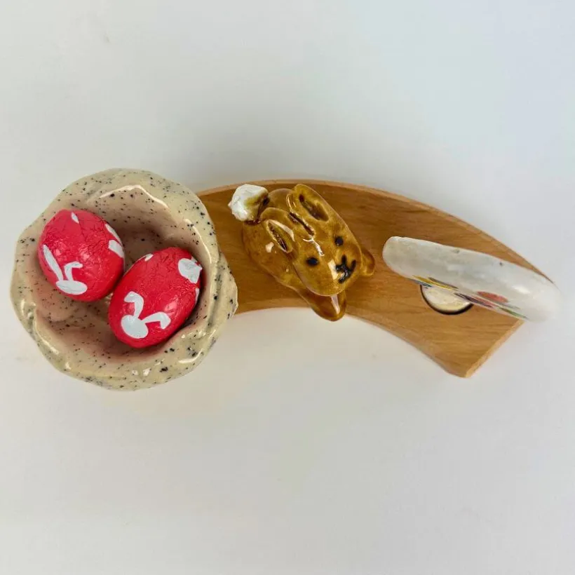 Deze set bestaat uit 3 handgemaakte stekers van keramiek; konijntje, paasei gestippeld en organisch schaaltje, excl. chocolade eitjes 😉